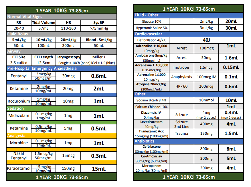 3.5 cuffed 12.5cm Bougie = 10Ch (paed) iGel = 1.5 (blue)